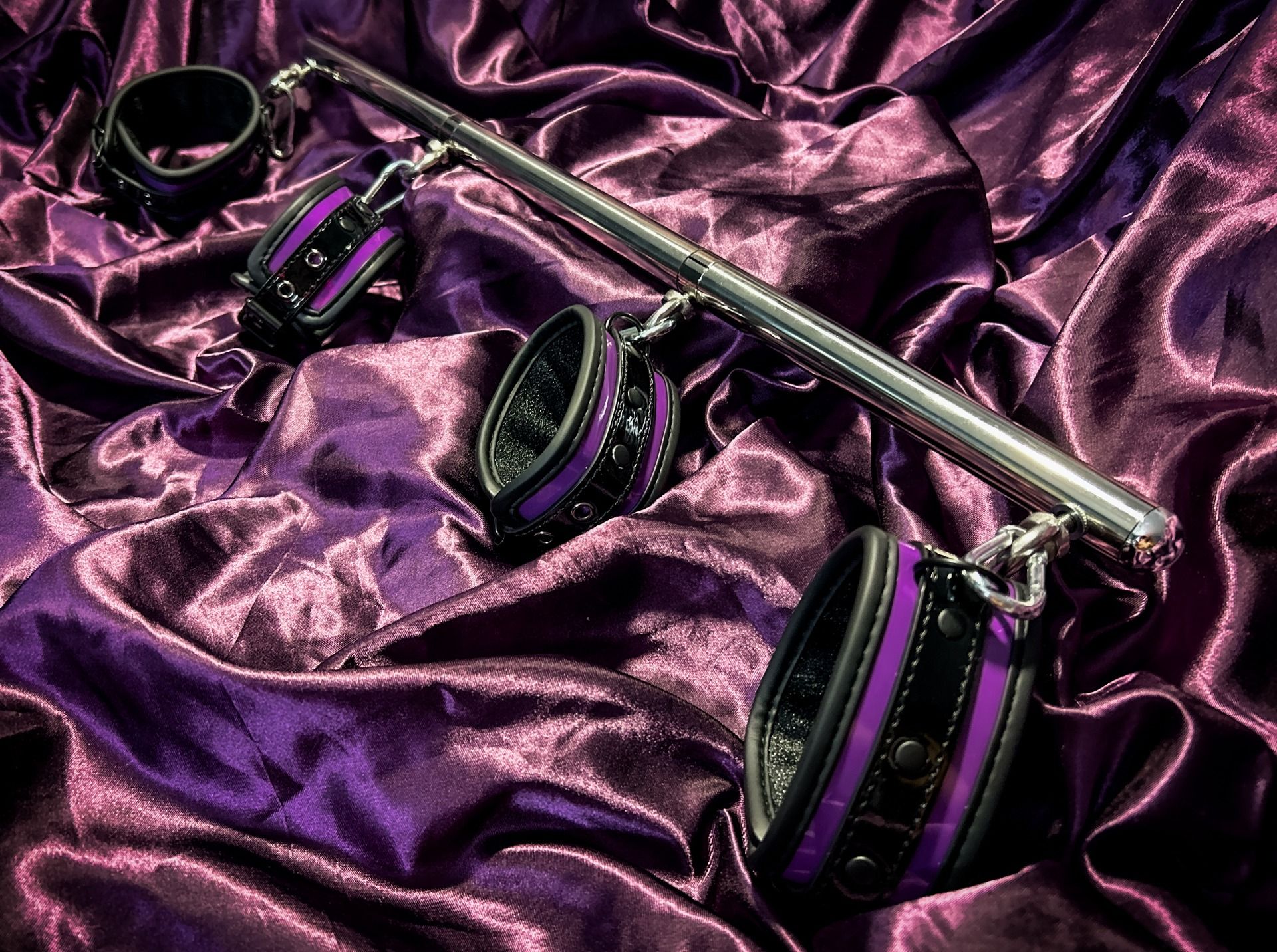 Barre d’écartement ajustable finition argent avec menottes poignets et chevilles ajustables. Structure rigide et résistante pour immobilisation stable et symétrique. Idéale pour jeux de domination consensuels, élégance et maintien sécurisé.
