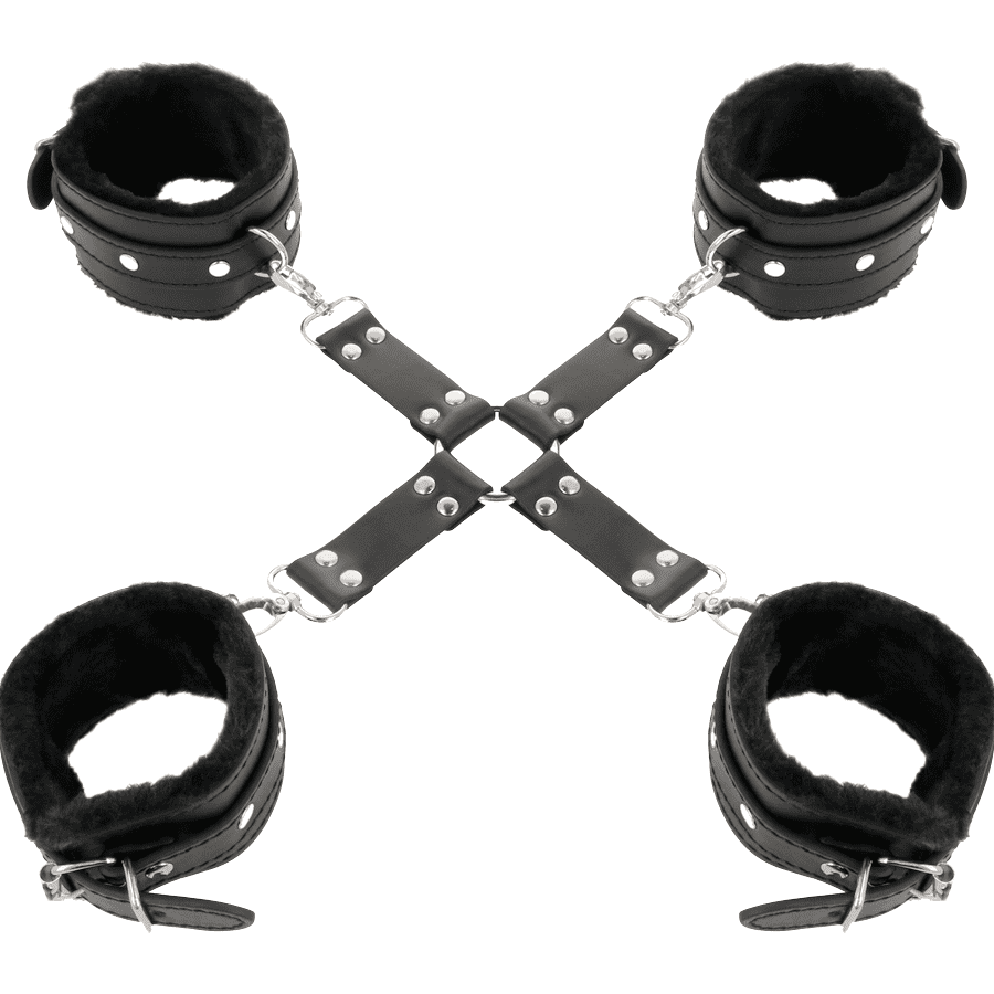 Son design en croix X en cuir vegan est renforcé par des attaches métalliques robustes pour une sécurité absolue, tandis que les intérieurs doublés de fausse fourrure noire offrent un confort moelleux, même pendant les sessions les plus prolongées.