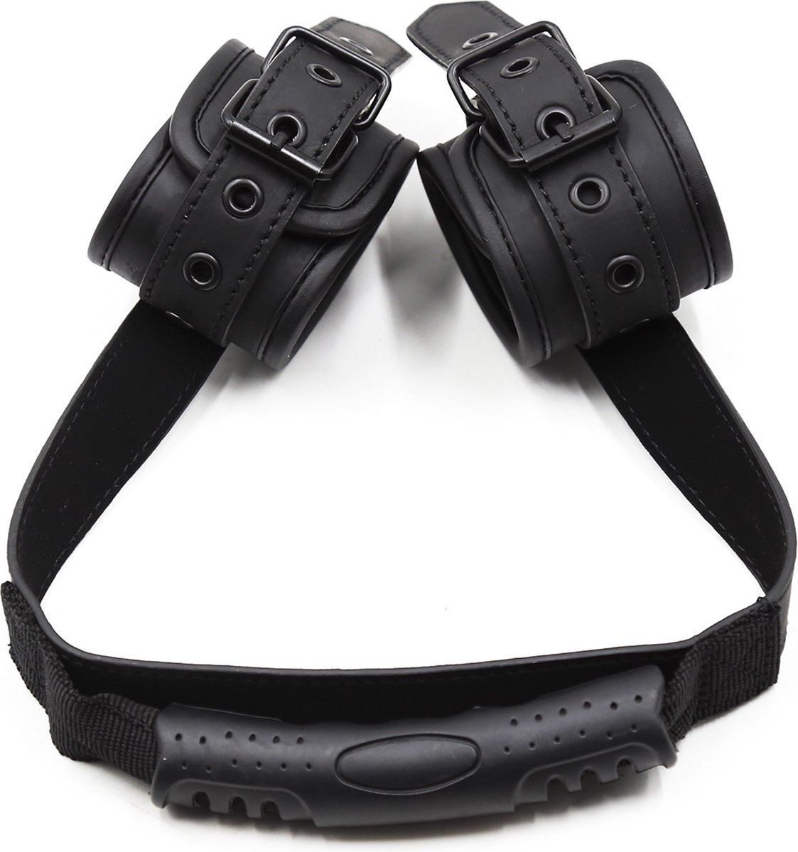 Menottes avec poignée centrale de maintien pour contrôle rapproché des poignets. Intérieur rembourré, boucles ajustables et anneaux métalliques solides. Idéal pour jeux de domination consensuels avec prise en main directe et maintien sécurisé.